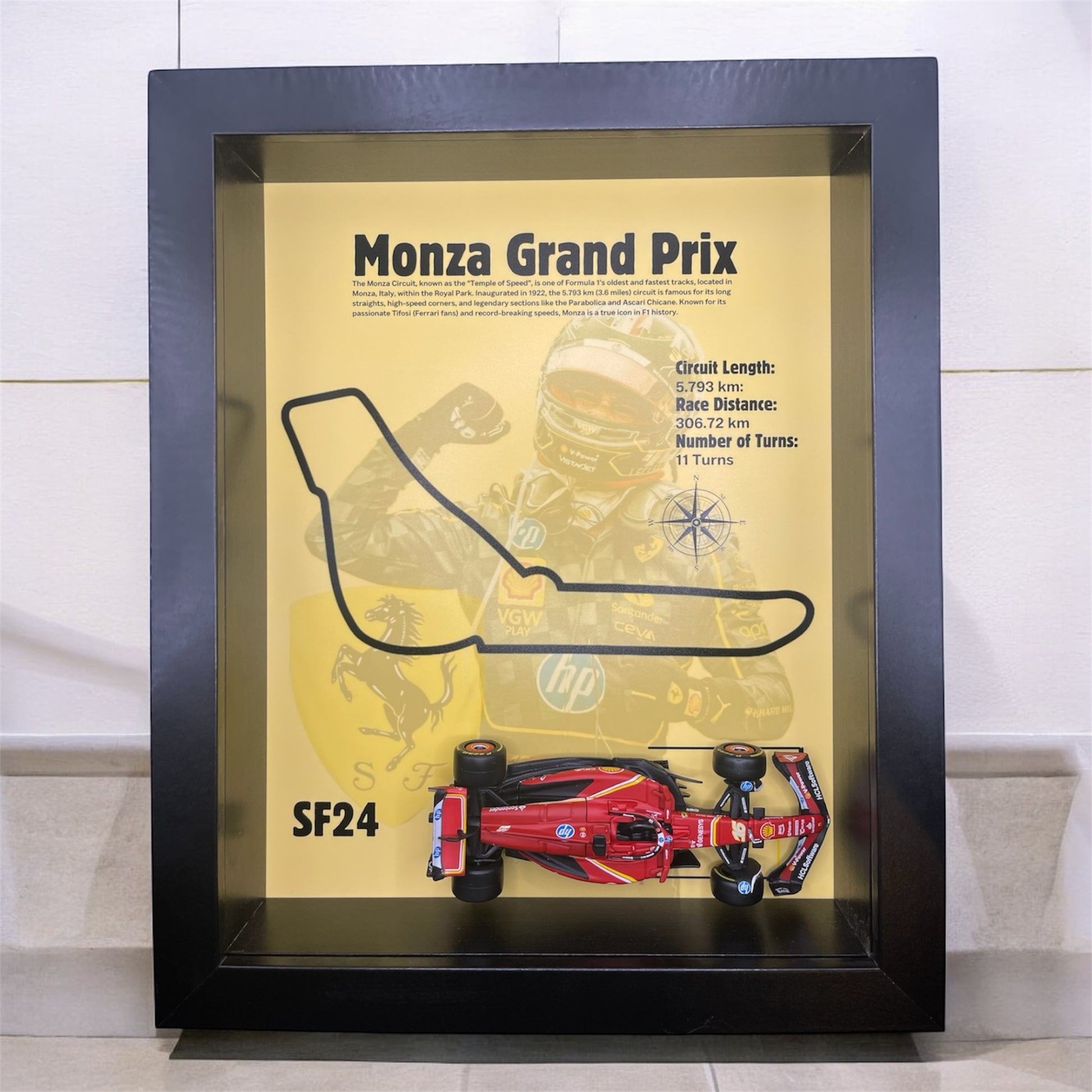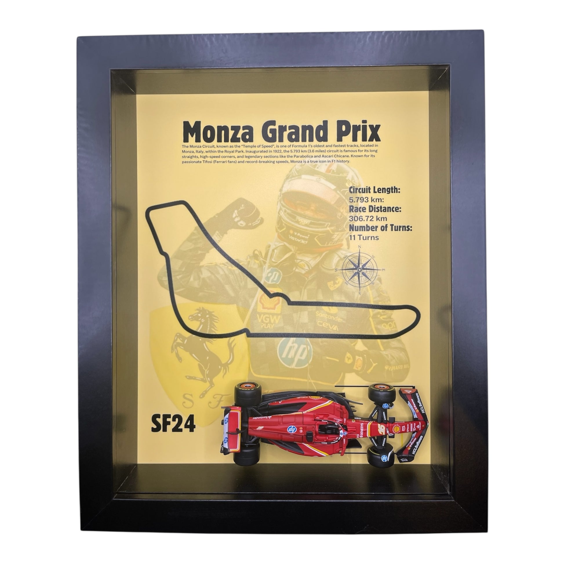 This handcrafted display showcases a detailed 1:43 scale diecast model of Charles Leclerc’s SF24, expertly mounted over a custom-designed background featuring the iconic Monza Grand Prix circuit. Key race info such as circuit length, total distance, and number of turns are highlighted — all protected behind real glass for a sleek, premium finish.